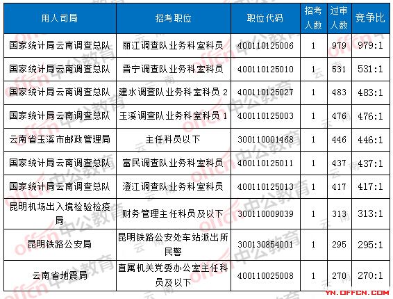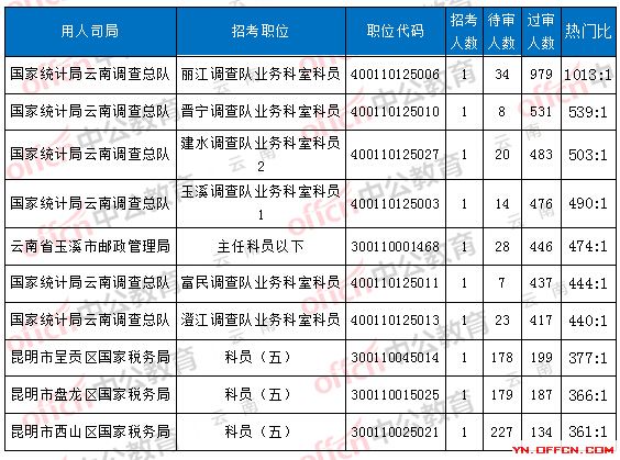 當前最受歡迎的崗位是國家統計局云南調查總隊,麗江調查隊業務科室科員,職位代碼:400110125006,招錄1人,1013人報名,其中34人待審核通過,詳情如下圖:
