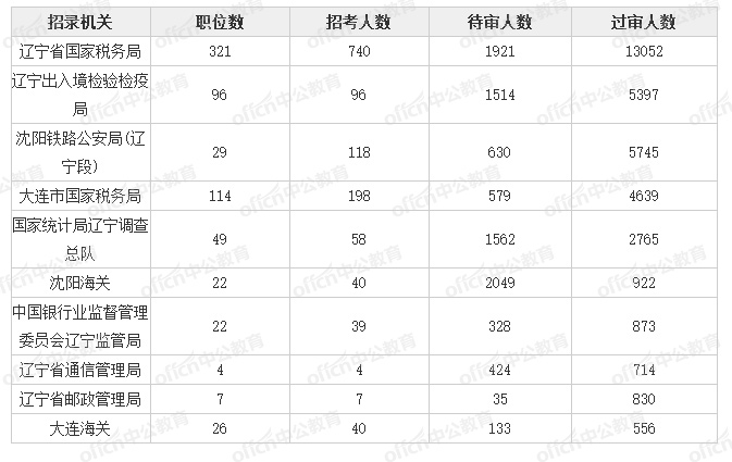 截止今日16時,遼寧省國稅局成招錄大戶。審核人數前三位的部門依次是:遼寧省國家稅務局、沈陽鐵路公安局、遼寧出入境檢驗檢疫局,三部門報名總人數達28259人,占報名總人數的60.2%;。