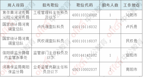 截止到11月7日16時,工作地點在河南的職位共有5個無人報考,占全部職位的0.74%,與昨天相比下降了0.74%。下面是無人報考職位一覽表,中公網校專家建議廣大考生多關注一些較冷職位,避免激烈競爭,結合自身條件,找到屬于自己的職位。