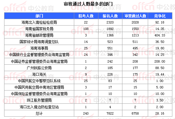 截止到8日16時(shí),通過(guò)審核人數(shù)前三位的部門依次是:海南出入境檢驗(yàn)檢疫局海南省國(guó)家稅務(wù)局、海南省郵政管理局、,三部門通過(guò)審核總?cè)藬?shù)達(dá)4791人,占通過(guò)審核總?cè)藬?shù)的70.09%。