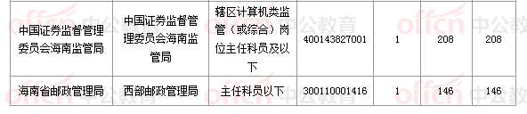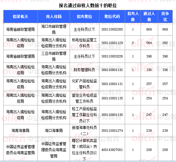 報名通過審核人數前十的職位主要集中在海南省郵政管理局、海南出入境檢驗檢疫局、海南海事局等部門,具體信息如下: