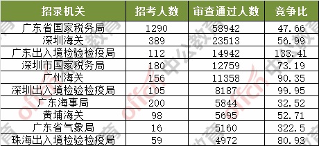 截至11月8日17時30分,據中公網校統計,國考職位中工作地點在廣東的職位通過審核總人數為174724,共有21個職位無人通過審核,平均競爭比例為62.9:1。