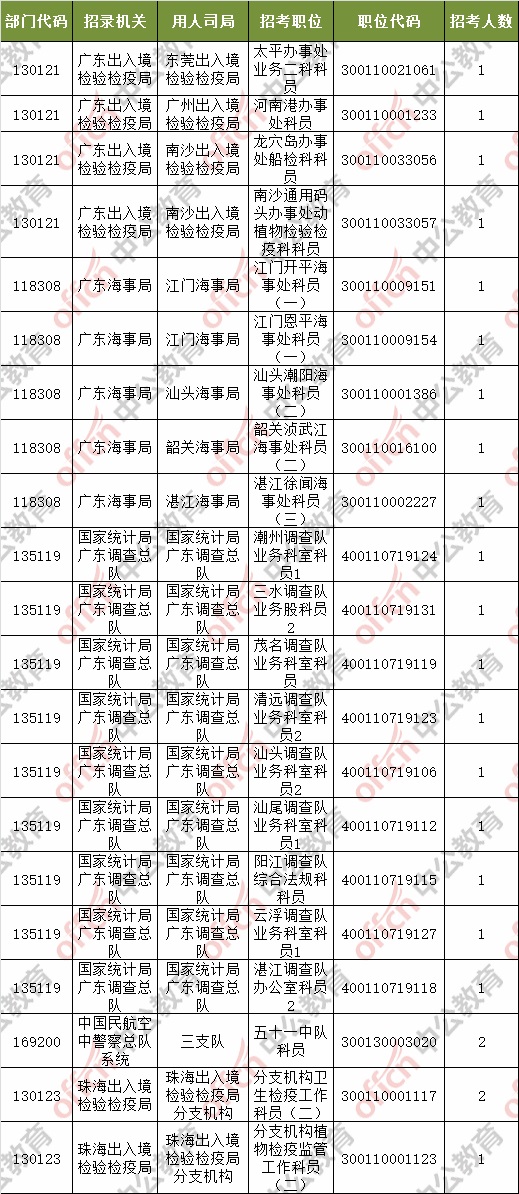 截止到8日17時30分,工作地點在廣東的職位共有21個無人報考,占全部職位的1.59%。下面是無人報考職位一覽表,中公網校專家建議廣大考生多關注一些較冷職位,避免激烈競爭,結合自身條件,找到屬于自己的職位。