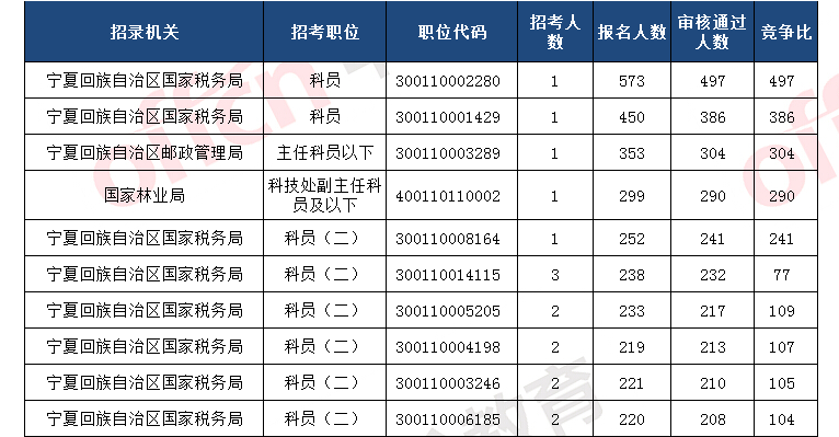 截止到11月8日17時30分,報名通過審核人數前十的職位主要為寧夏回族自治區國家稅務局、寧夏回族自治區郵政管理局,具體信息如下: