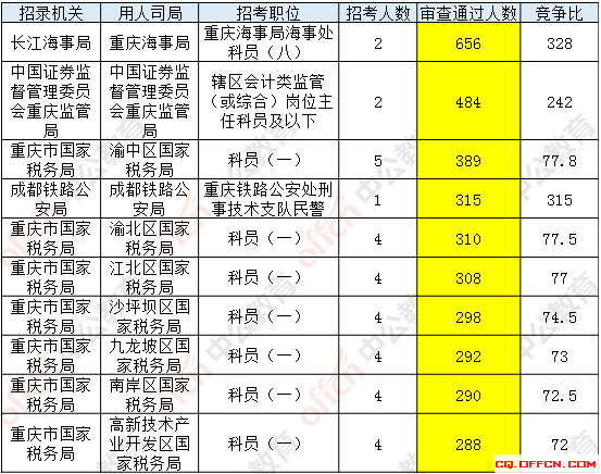 報名通過審核人數前十的職位主要集中在長江海事局、中國證券監督管理委員會重慶監管局、重慶市國家稅務局、成都鐵路公安局四個部門。報名通過審核人數最多的職位亦是競爭比例的職位。報名通過人數位居第二的中國證券監督管理委員會重慶監管局的職位主要是從事從事轄區會計類監管或內部綜合管理等工作,為特殊專業職位(證監法律類)職位,共兩個職位,且皆不限政治面貌、基層工作最低年限、服務基層項目工作經歷。而重慶市國家稅務局的職位最熱崗位的政治面貌、基層工作最低年限、服務基層項目工作經歷皆不限。主要招錄2016年及以后年度畢業的高校畢業生,女性,在本單位最低服務年限為5年的考生。