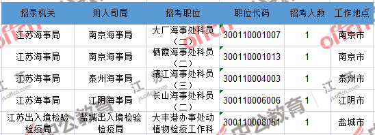 截止到8日17:30時,工作地點在江蘇的職位共有5個無人報考,占全部職位的0.42%。下面是無人報考職位一覽表,中公網校專家建議廣大考生多關注一些較冷職位,避免激烈競爭,結合自身條件,找到屬于自己的職位。