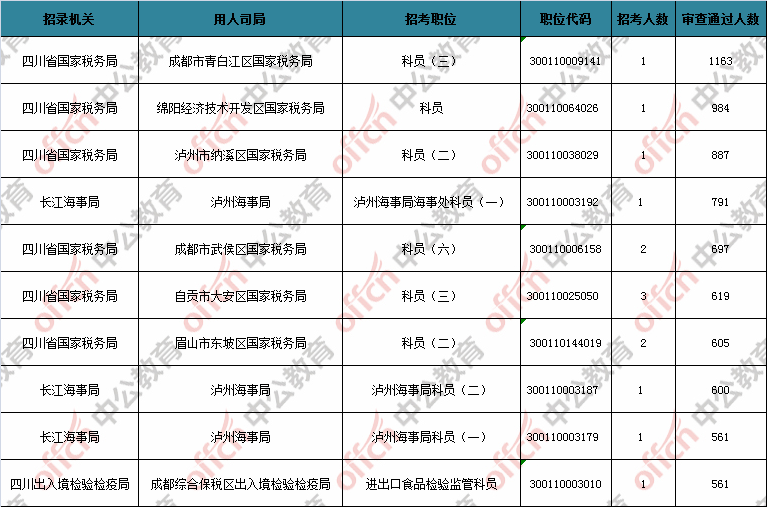 截止到8日18:00,競爭比例的職位為“成都市青白江區國家稅務局科員(三)”一職,招錄1人,截止到8日18:00通過人數為1163人。中公網校整理了報名通過審核人數前十的職位供廣大考生參考: