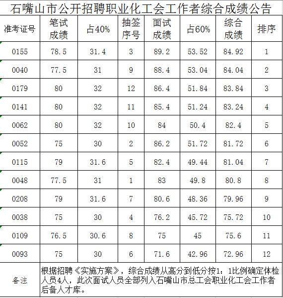2015寧夏石嘴山市職業化工會工作者招聘綜合成績公告