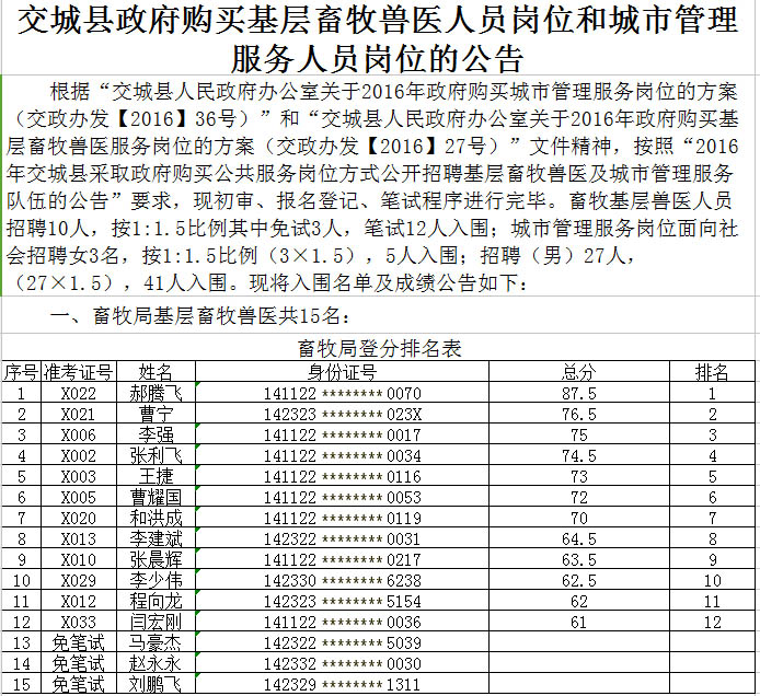 原標題:交城縣政府購買基層畜牧獸醫人員崗位和城市管理服務人員崗位的公告