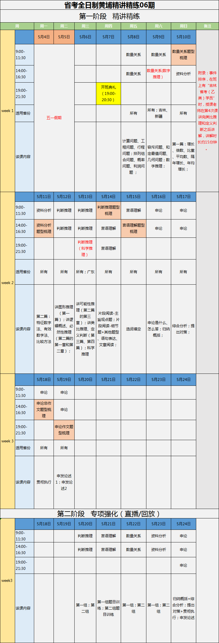 2020年省考黃埔全日制精講精練直播特訓(xùn)營(yíng)課表