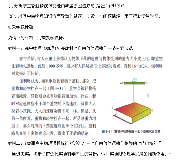 (1)簡要分析材料一內容在“自由落體運動”一節中的作用