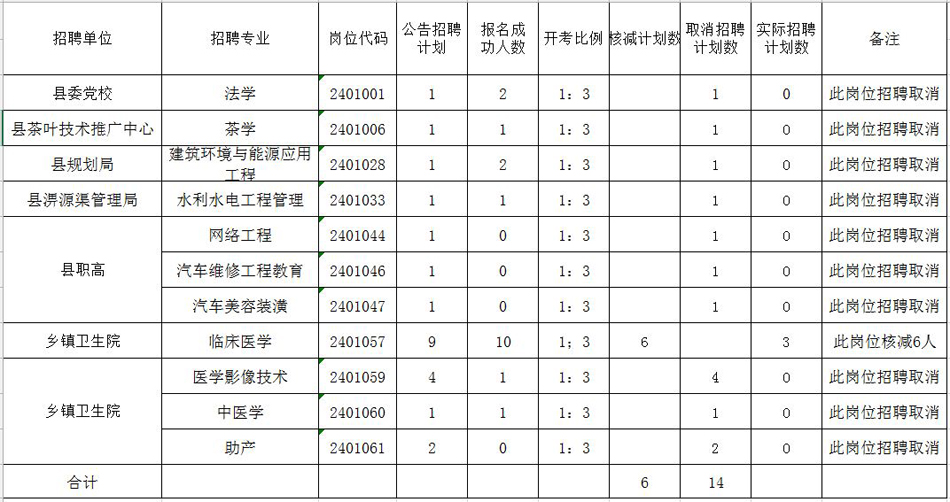 根據2015年霍山縣部分事業單位公開招聘工作人員公告精神,下列招聘崗位因報考人數達不到開考比例或無人報考,按規定核減和取消招聘計劃數,現公告如下,請報考取消招聘崗位的考生于4月30日13:00-17:00改報其他符合條件的崗位。逾期不改報的,按退費處理。