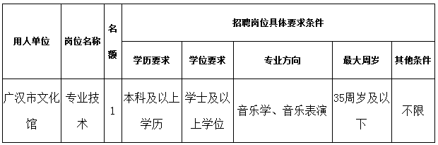 根據(jù)《關(guān)于事業(yè)單位招聘藝術(shù)專業(yè)技術(shù)人員的意見》(川人發(fā)〔2007〕43號(hào))和《關(guān)于進(jìn)一步規(guī)范事業(yè)單位工作人員和機(jī)關(guān)工勤人員招聘工作的通知》(德人社〔2013〕5號(hào))等文件規(guī)定,經(jīng)研究決定,廣漢市文廣局下屬事業(yè)單位市文化館擬面向社會(huì)公開考核招聘1名工作人員,現(xiàn)將有關(guān)事項(xiàng)公告如下: