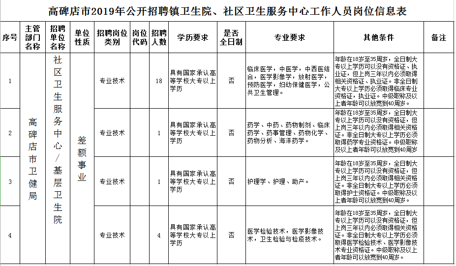 二、招聘崗位及人數共招聘24人,其中:臨床18人、護理1人、醫學影像4人、藥學1人。具體崗位及條件等詳見《高碑店市2019年公開招聘鎮衛生院、社區衛生服務中心工作人員崗位信息表》。