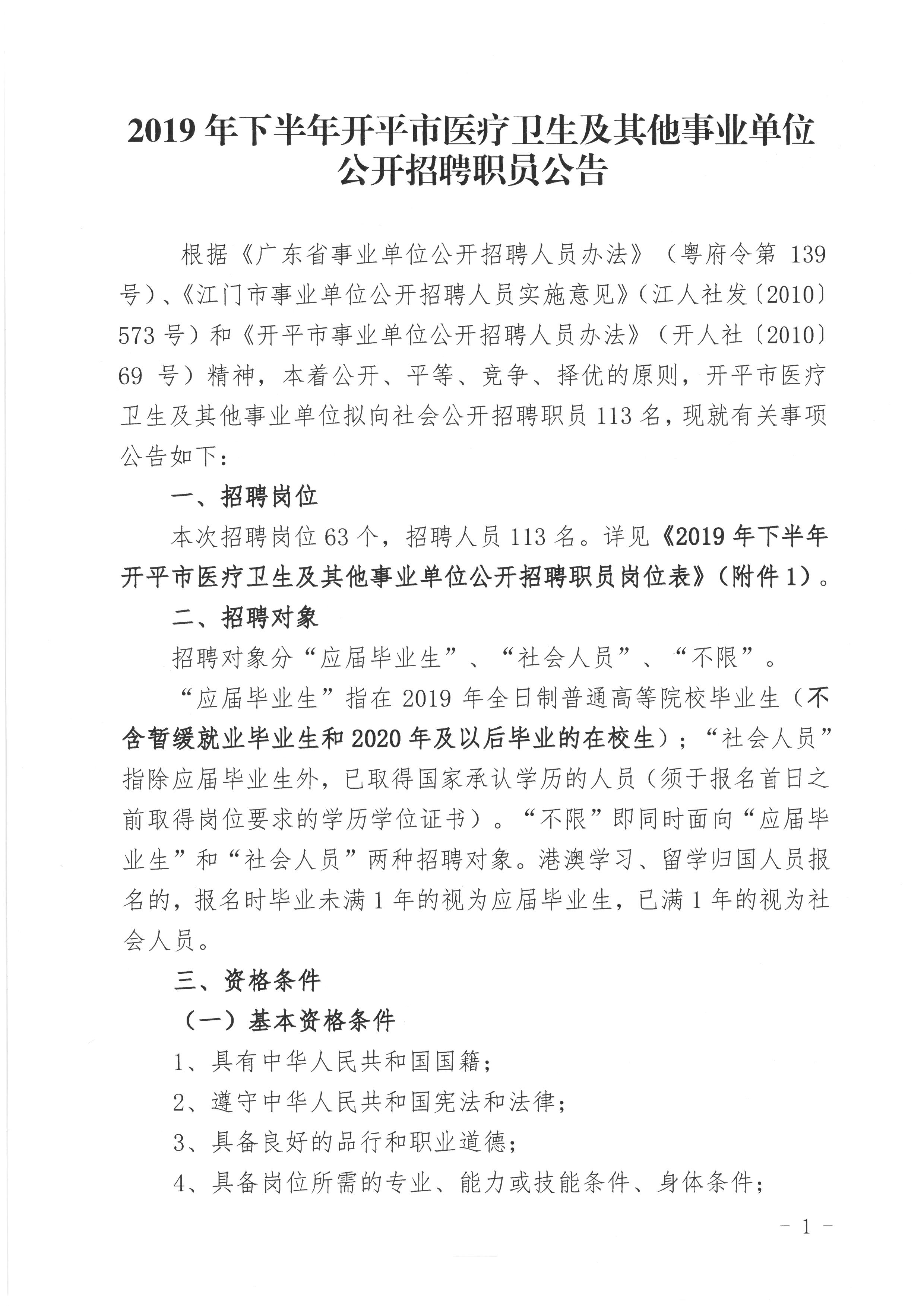 2019年下半年廣東江門開平市醫療衛生及其他事業單位公開招聘職員113人公告