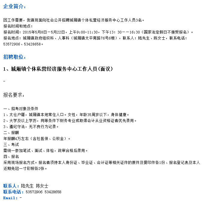 2015年江蘇省太倉市城廂鎮人民政府個體私營經濟服務中心招聘公告【招3人】