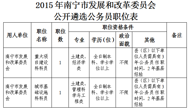 南寧市發(fā)展和改革委員會(huì)重大項(xiàng)目建設(shè)科科員1名、城市基礎(chǔ)設(shè)施科科員1名。
