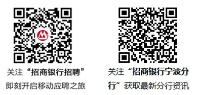 官方微信:掃描下方二維碼,關(guān)注“招商銀行招聘”微信公眾平臺(tái),獲取的校園招聘信息,點(diǎn)擊“校園招聘”,申請(qǐng)感興趣的職位,投遞簡(jiǎn)歷!