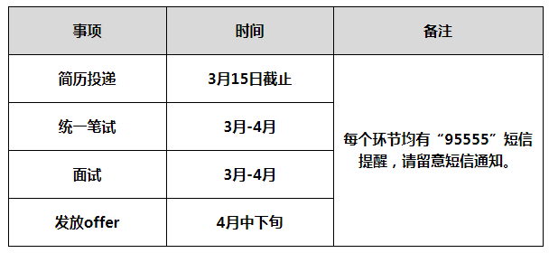 簡(jiǎn)歷投遞3月15日截止每個(gè)環(huán)節(jié)均有“95555”短信提醒,請(qǐng)留意短信通知。