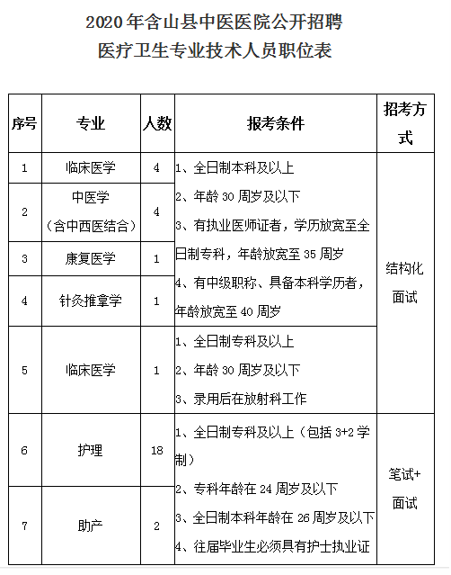6. 學歷及其他要求詳見《2020年含山縣中醫醫院公開招聘醫療衛生專業技術人員職位表》(附件1)。