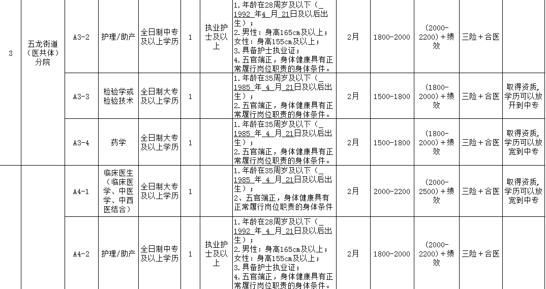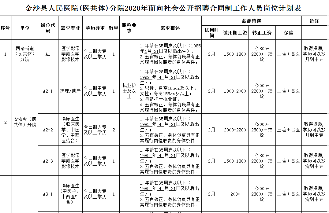 三、待遇:按照《金沙縣人民醫(yī)院(醫(yī)共體)分院關(guān)于聘用人員工資通知》執(zhí)行,繳納三險(xiǎn)(養(yǎng)老保險(xiǎn)、工傷保險(xiǎn)、失業(yè)保險(xiǎn))及合醫(yī)。