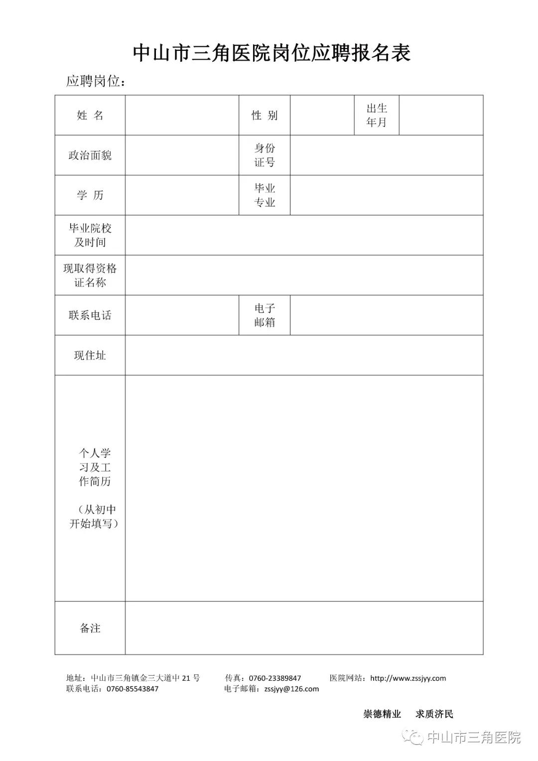 包括居民身份證、畢業證、從業資格證等掃描件,個人簡歷1份,并填寫《中山市三角醫院崗位應聘報名表》發送到中山市三角醫院電子郵箱zssjyy@126.com。
