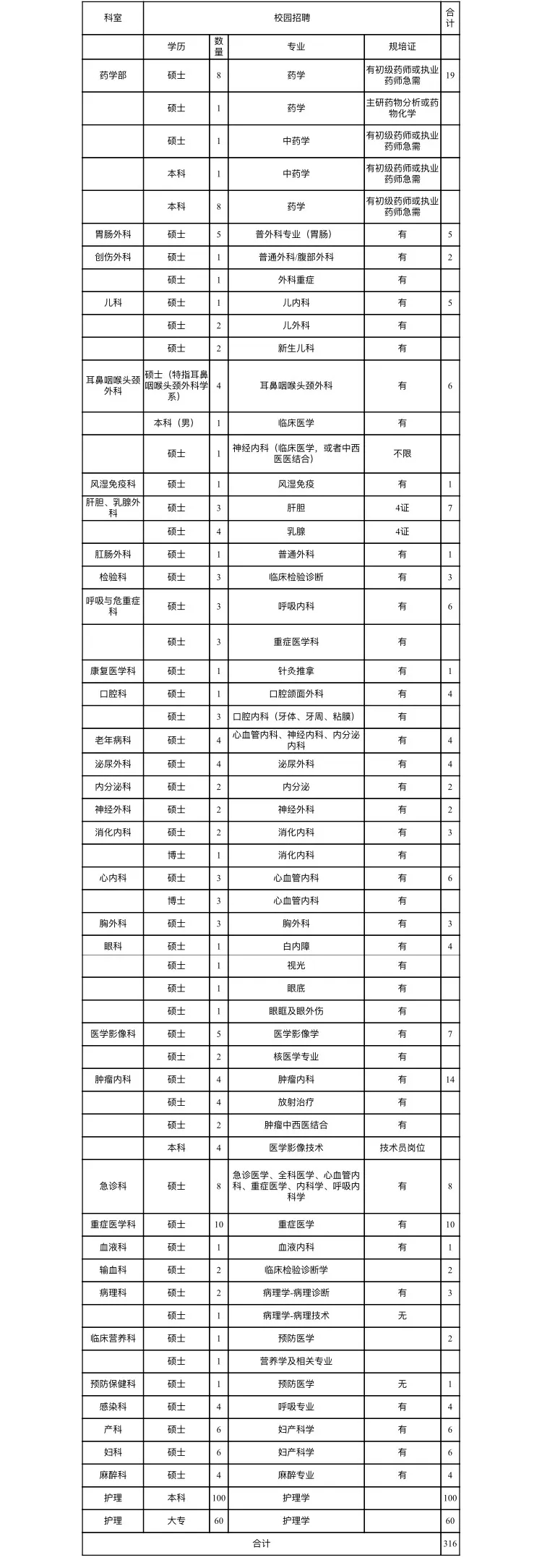 三、應屆(2019、2020年)畢業生。醫療、醫技專業需取得碩士及以上學歷,取得執業證書、規培證書;藥學、檢驗、技師專業需取得碩士及以上學歷,取得執業證書;護理學專業需取得統招全日制??萍耙陨蠈W歷(不含3+2???,要求高中起點(不含職業高中),取得護士執業證書;