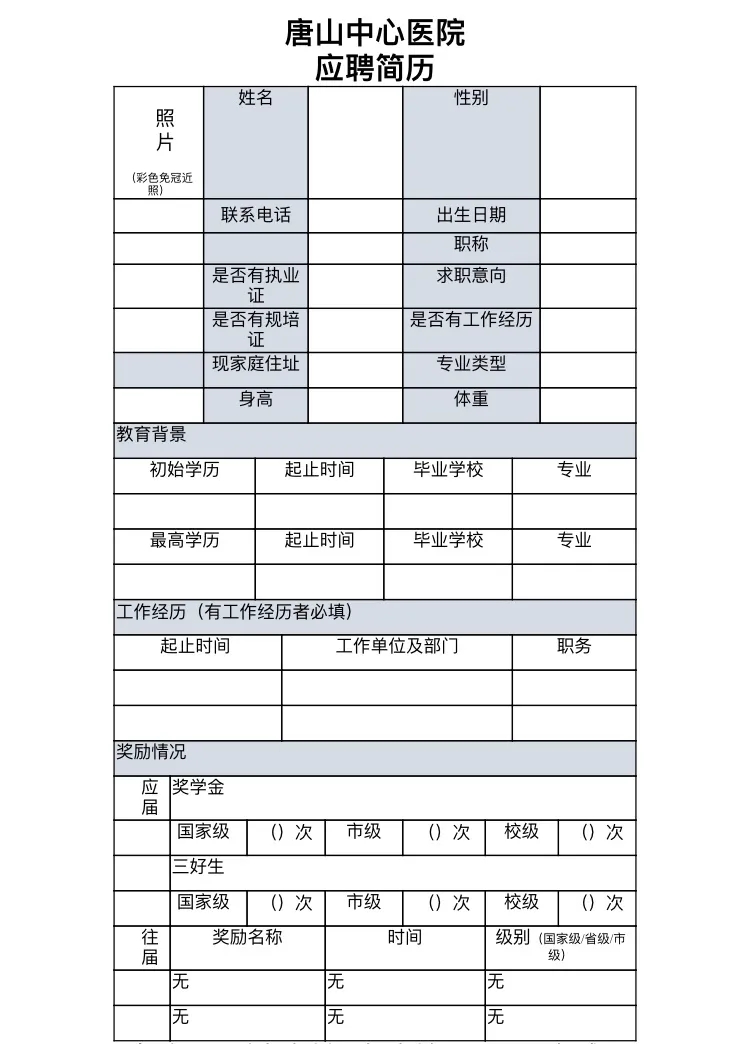 1.應聘簡歷:關注微信公眾號(唐山中心醫院),下載應聘簡歷模板,按要求填寫。