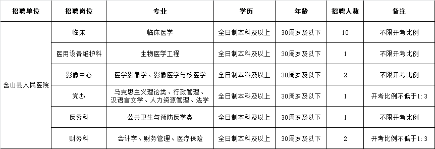 一、招聘計劃:臨床醫學10名、醫學影像學2名、財務2名、黨辦1名、公共衛生與預防醫學1名、生物醫學工程1名,各崗位具體要求及說明詳見《含山縣人民醫院2020年公開招聘部分崗位工作人員職位表》。
