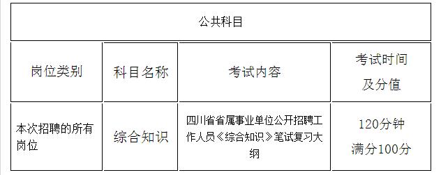 本次招聘考試所有崗位的筆試科目為公共科目。《四川省省屬事業單位公開招聘工作人員《綜合知識》筆試復習大綱》見附件2,筆試均不指定復習資料,各崗位具體考試科目如下: