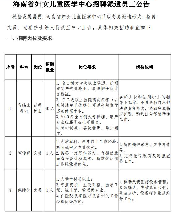 2020海南省婦女兒童醫學中心招聘派遣員工公告助理護士、文員公告【招43人】