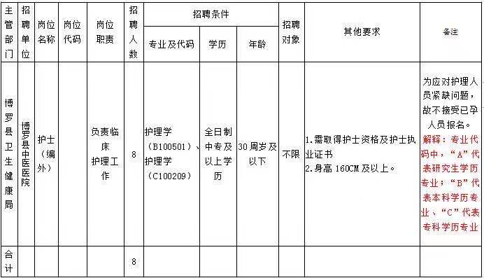 根據《廣東省事業單位公開招聘人員辦法》(粵府令第139號)、《博羅縣進一步深化基層醫療衛生機構綜合改革工作方案》(博衛〔2018〕58號)和《博羅縣衛生人才發展三年攻堅規劃實施方案》(博衛〔2018〕68號)文件精神,現面向社會公開招聘8名編外護理人員,具體公告如下: