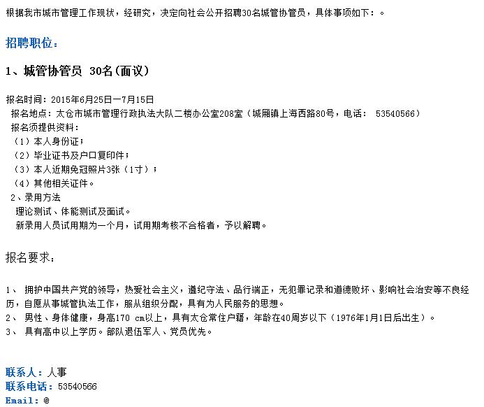 2015江蘇太倉市城市管理行政執法大隊招聘城管協管員公告【招30人】