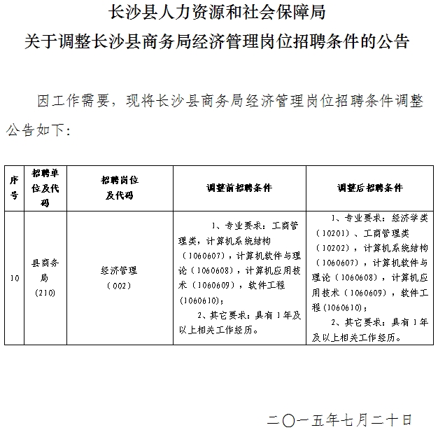 2015湖南長沙縣商務局經濟管理崗位招聘條件調整公告