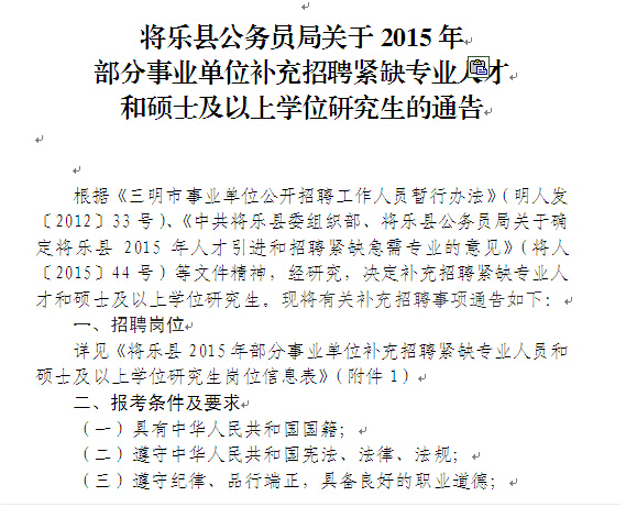 2015福建將樂縣事業單位補充招聘緊缺專業人才和碩士及以上學位研究生公告【招35人】