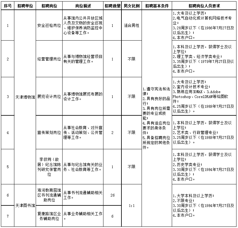 根據工作需要,天津市文廣局屬事業單位天津博物館、天津圖書館面向社會公開招聘社會化用工,社會化用工人員不具有事業編身份。經筆試、面試、體檢、政審,確定用工的人員與天津博物館、天津圖書館委托的勞務派遣公司按規定程序訂立派遣合同,并派遣到天津博物館、天津圖書館工作。現將有關事項公告如下: