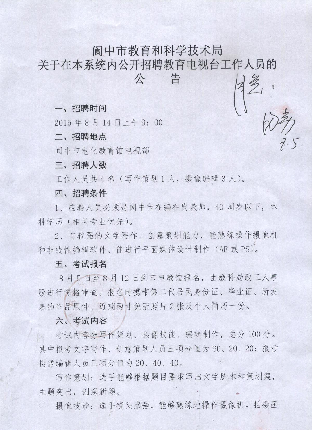 2015四川閬中市教育和科學技術局本系統(tǒng)內招聘教育電視臺人員公告【招4人】