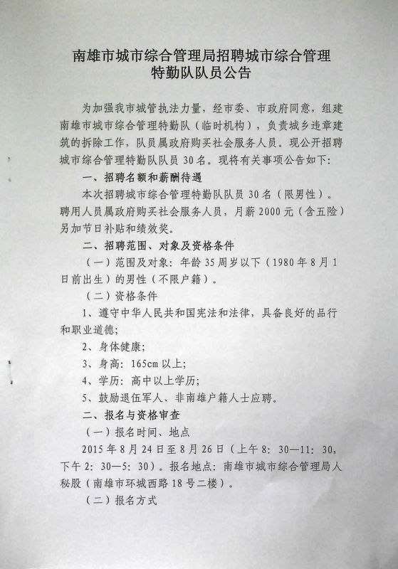 2015廣東南雄市城市綜合管理局招聘城市綜合管理特勤隊隊員30人公告