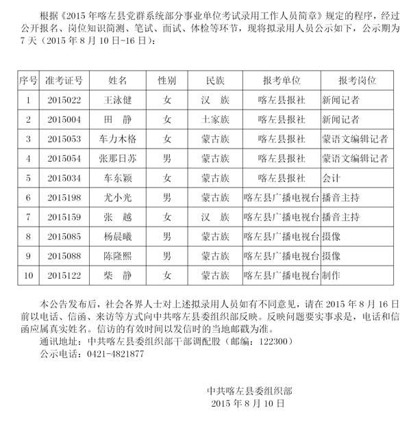 原標題:2015年喀左縣黨群系統部分事業單位考試錄用工作人員公告(六)