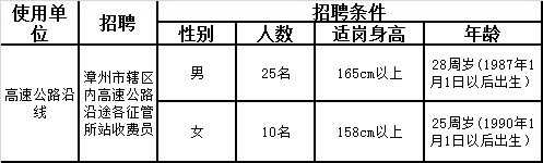 高速公路漳州管理分公司系福建省高速公路有限責任公司下屬的國有企業單位,負責管轄漳州市境內所有已通車運營的高速公路共500多公里。為確保9月份漳州漳永、常東兩個高速公路建設項目通車運營管理,根據有關規定,結合我公司實際情況,現面向社會公開招聘收費人員。現將有關招聘事項公告如下: