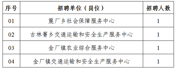 2015年我縣鄉鎮事業單位面向全省統一選聘、在我縣任滿兩個聘期的大學生村官招聘4名工作人員,具體崗位如下: