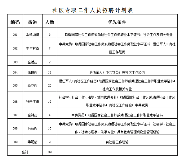 面向社會招聘社區(qū)專職工作人員89人,具體招聘計劃見下表: