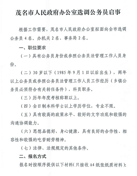 2015廣東茂名市府辦選調公務員4人公告
