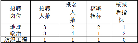 根據(jù)《天臺(tái)縣教育局 天臺(tái)縣人力資源和社會(huì)局 關(guān)于天臺(tái)縣教育局校園招聘2016屆高校畢業(yè)生的公告》規(guī)定,“報(bào)名人數(shù)與錄用崗位須達(dá)到 2∶1及以上的比例方可開考,未達(dá)比例的相應(yīng)核減錄用指標(biāo)或不開考。”經(jīng)研究,決定對以下錄用崗位指標(biāo)進(jìn)行核減。
