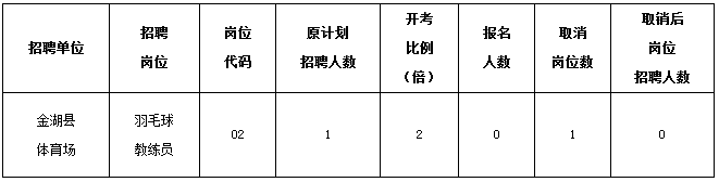 2015年金湖縣體育局公開招聘事業單位工作人員報名工作已經結束。根據《2015年金湖縣體育局公開招聘事業單位工作人員公告》的規定,對達不到開考比例的招聘崗位予以取消。現將取消崗位公告如下: