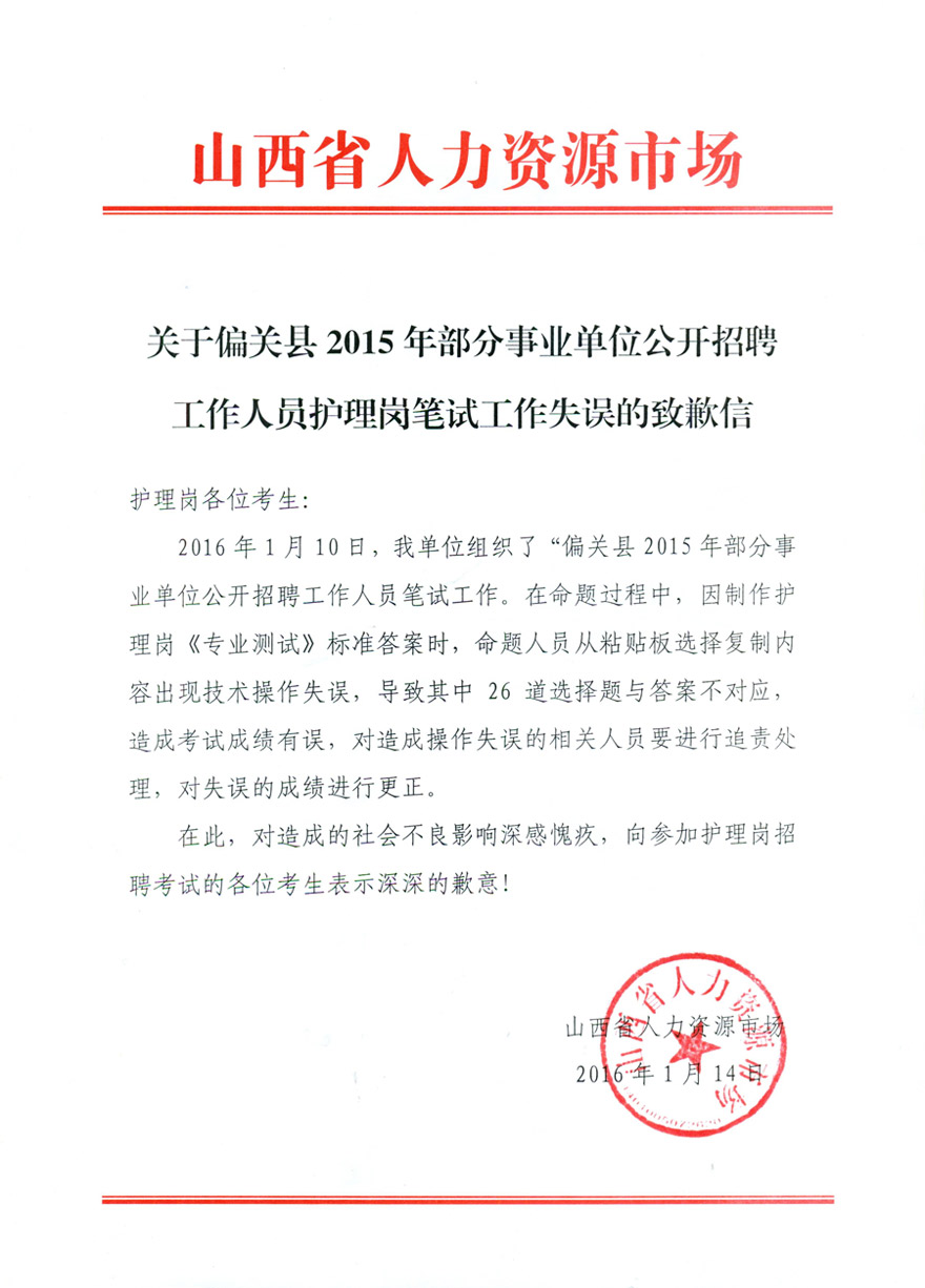 2015山西偏關縣事業單位招聘護理崗位筆試工作失誤的致歉信