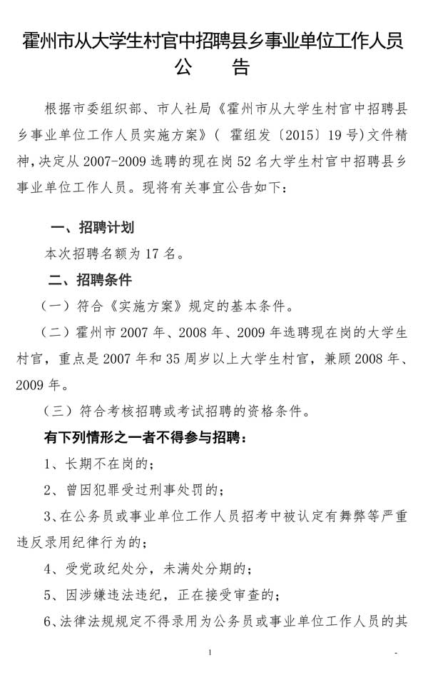 2016山西霍州市縣鄉事業單位招聘17人公告(從大學生村官中)【招17人】