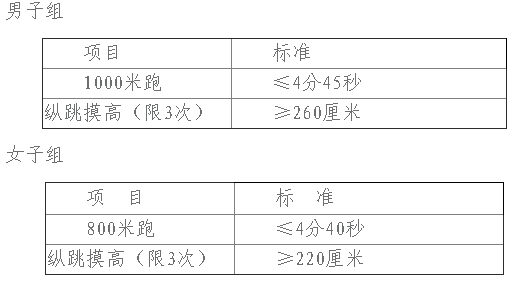(1)體能測(cè)試。體能測(cè)試項(xiàng)目和標(biāo)準(zhǔn)如下: