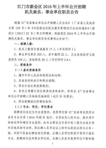 2016上半年廣東江門市新會區(qū)招聘機(jī)關(guān)雇員、事業(yè)單位職員公告【222人】