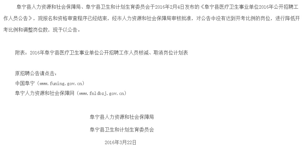 原標題:關于2016年阜寧縣醫療衛生事業單位公開招聘工作人員降低開考比例和調整崗位數的補充公告